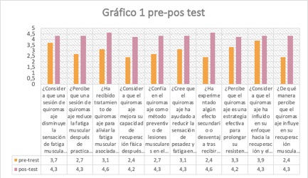 Resultados: Los resultados mostraron una reducción significativa de la fatiga muscular y una mejora en los marcadores de recuperación después del masaje deportivo. El análisis estadístico arrojó diferencias significativas entre las mediciones pre y post intervención (p = 0,01), lo que corrobora el efecto positivo del masaje en la recuperación muscular.