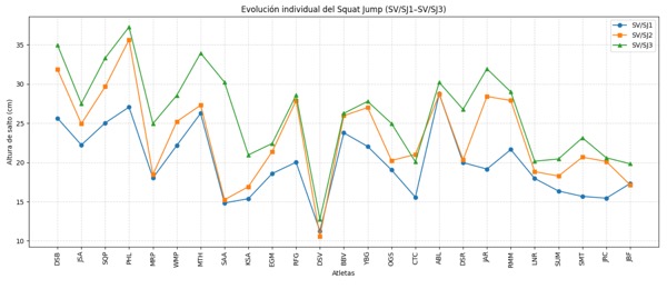 A nivel individual, los datos revelan que la mayoría de los deportistas mejoraron entre la primera y la tercera medición, con cambios que fueron desde pequeños hasta muy grandes en la altura del salto. Algunos deportistas mostraron aumentos de más de 10 cm, otros progresaron menos, e incluso hubo casos puntuales de escasas variaciones. Esta variabilidad individual hace necesario el uso de métodos individualizados de entrenamiento y refuerza la necesidad de una evaluación periódica con pruebas objetivas como el SJ para controlar la evolución del rendimiento y realizar los ajustes necesarios en la preparación física.
