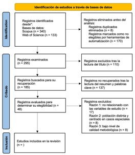 La elección de los estudios se llevó a cabo de forma sistemática, siguiendo las etapas descritas en la declaración PRISMA 2020. En la identificación, la búsqueda en las bases de datos Scopus y Web of Science arrojó 473 resultados (Scopus = 340; Web of Science = 133). Luego, antes del análisis, se eliminaron 8 registros duplicados y 170 registros fueron excluidos por las herramientas de automatización por no ser elegibles, lo que dejó 295 registros para la etapa de cribado. En esta etapa, después de leer los títulos, se eliminaron 110 registros; los 185 estudios restantes se revisaron en cuanto a resúmenes y palabras clave, lo que llevó a eliminar 137 registros que no cumplían con los criterios temáticos.