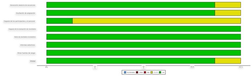 Además, para mejorar la transparencia e interpretación de los resultados, se evaluó el riesgo de sesgo siguiendo las recomendaciones metodológicas actuales para revisiones sistemáticas, utilizando los criterios descritos por McGuinness y Higgins (2020). Esta metodología hizo posible reconocer potenciales sesgos de selección, medición y presentación de resultados, y visualizarla gráficamente con herramientas estandarizadas de representación. Los resultados de este proceso mostraron que los estudios en su mayoría son de alta calidad metodológica y bajo riesgo de sesgo, lo que apoya la validez interna y externa de las conclusiones de esta revisión sistemática.