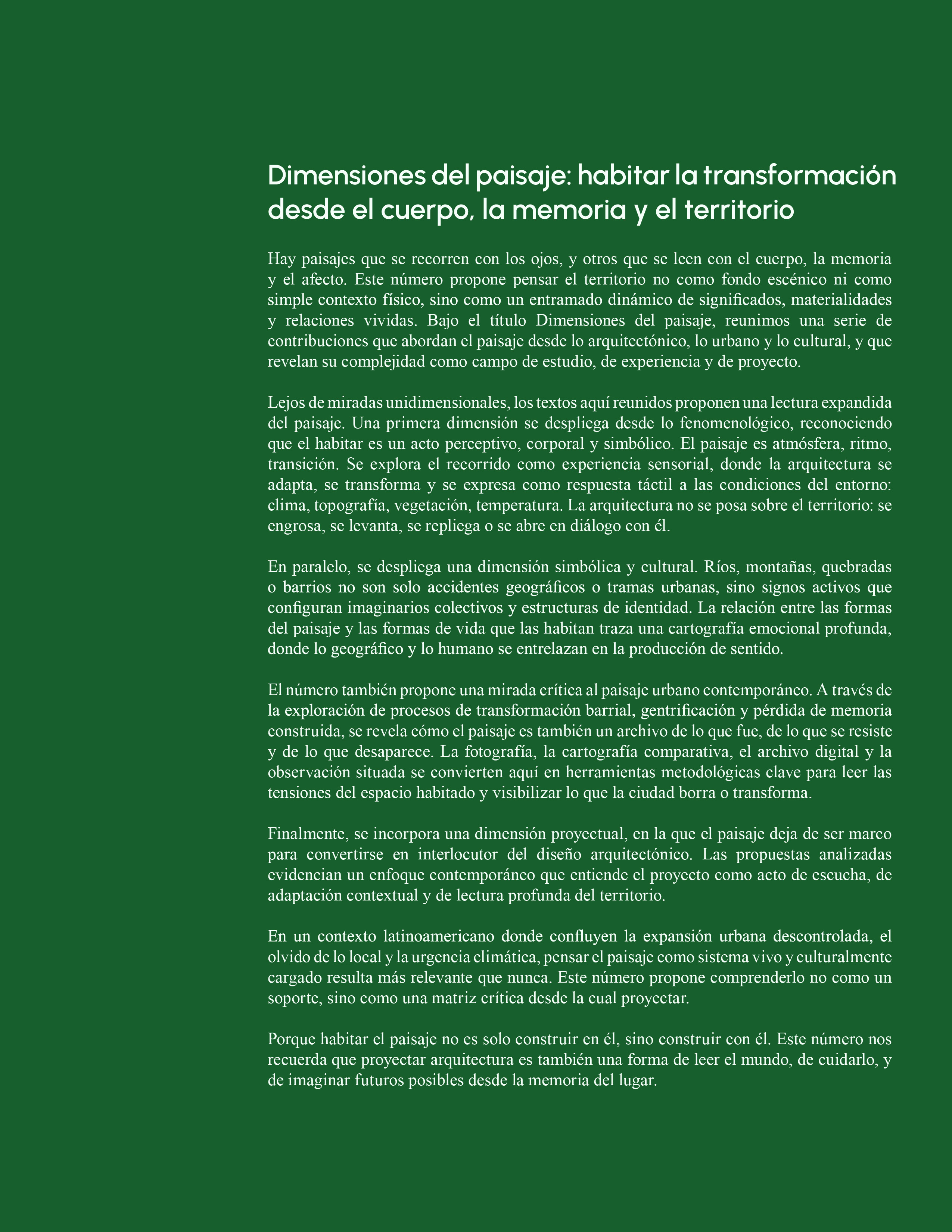 El octavo número de la revista ARTES contiene cinco artículos y un ensayo que exploran el paisaje como concepto dinámico y multidimensional, integrando perspectivas geográficas, urbanas, arquitectónicas y sensoriales, amplía el pensamiento crítico y proyectual sobre la manera en que concebimos, diseñamos y experimentamos el paisaje en sus diversas dimensiones.