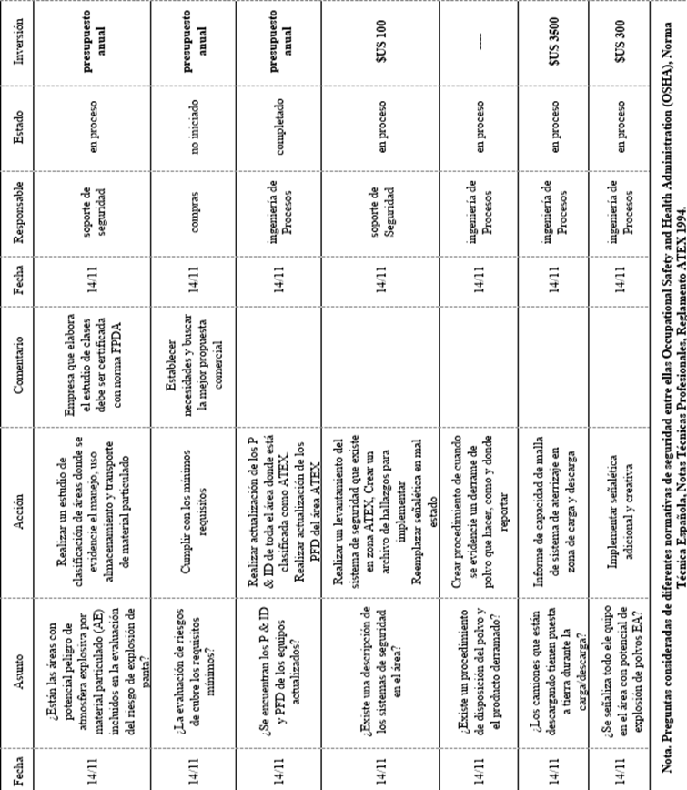 Resumen. Las industrias que manejan polvos combustibles están sujetas a regulaciones y normativas estrictas para prevenir y controlar el riesgo de explosiones. Las atmósferas explosivas (ATEX) son mezclas de sustancias inflamables en forma de gas, vapor niebla o polvo en el aire, que pueden generar una explosión si se encuentra en condiciones adecuadas. Se desarrolló una herramienta que garantice la salud de los trabajadores y la protección de las instalaciones frente al riesgo de explosión por polvo, mediante la identificación y clasificación de las atmósferas explosivas, así como la aplicación de las medidas técnicas y organizativas adecuadas, basada en criterios obtenidos a partir de una revisión sistemática de la literatura (PRISMA). El nuevo panel de control permite analizar la evolución del nivel de adherencia a los indicadores de seguridad en zonas clasificadas como explosivas por polvo. Está formado por un cuestionario, y un plan de acción y rampa de implementación de seguridad. El panel de control constituye una herramienta importante en la gestión de los riesgos mediante la supervisión y control, guiando los procedimientos, y promoviendo la capacitación y buenas prácticas en ambientes de trabajo potencialmente explosivos, con el fin de concientizar y minimizar los accidentes e incidentes por polvo combustible.