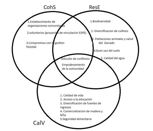 Figura 3. Interrelación entre Cohesión social y solución de conflictos (CohS), Restauración del ecosistema (ResE) y Medios de Calidad de Vida (CALV) de los GF.