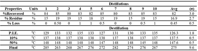 Losses remained low, with values between 0% and 1%, indicating good control of losses during distillation. Regarding characteristic boiling points (BWP), the results showed greater variability. The initial boiling point (IBP) ranged between 127°C and 135°C. Boiling points at percentiles (10%, 50%) and the final boiling point exhibited variations, with averages of 137.5°C, 147.6°C, and 275°C, respectively, and adjusted standard deviations of 0.5°C.