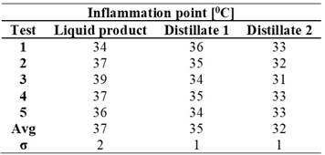 The results indicated that the initial fuel had a flash point range between 34°C and 39°C, with an average of 37°C (Table 5). In contrast, the distillates obtained after the refining process showed lower values: the first distillate averaged 35°C, while the second recorded 32°C. This suggests that the distillation process not only affects the chemical composition but also the product's volatility, making the distillates more susceptible to ignition compared to the original liquid.