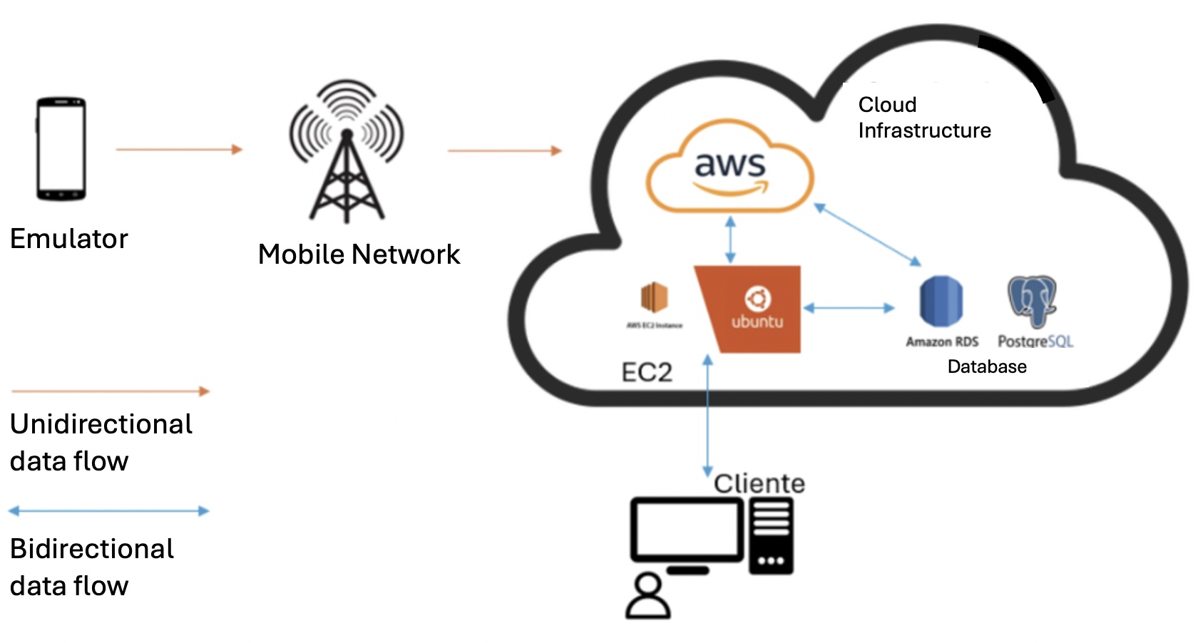 Figure 1 shows the detailed operation. The system operates with an emulator on a terminal device, connected via the mobile network, generating data sent to a NodeJS and ExpressJS server hosted on an AWS EC2 Ubuntu instance. This server processes the data and stores it in an AWS RDS PostgreSQL database. Client terminals interact with the system through a web application hosted on the EC2 instance, accessing stored data via secure APIs. The platform enables real-time and historical data visualization, geolocation tracking, and statistical analysis through a responsive interface, ensuring seamless monitoring and efficient data management.