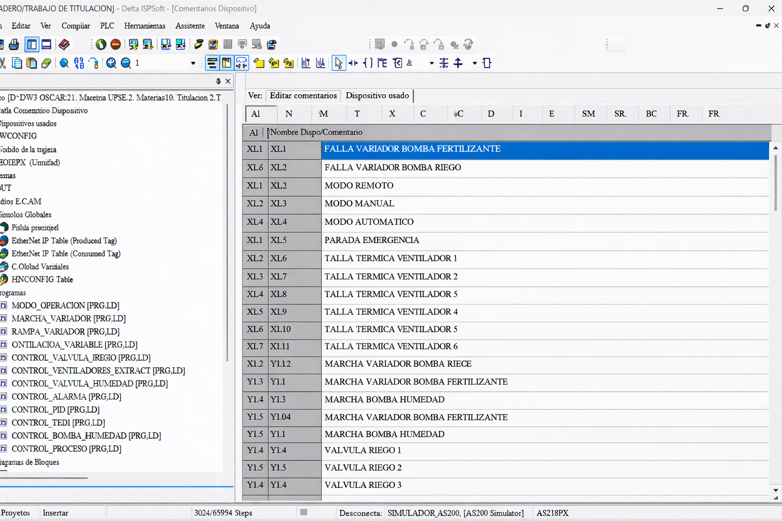To enhance process safety and system reliability, the PLC program includes a dedicated alarm and fault management module. Figure 2 presents the alarm structure implemented in the PLC, which monitors abnormal conditions related to irrigation and fertilization pumps, ventilation units, extractors, and emergency stop events. When a fault is detected, the system activates the corresponding alarm and places the process in a safe state, allowing operator intervention (Carrasco Agraces, 2024; Traiphat et al., 2025).