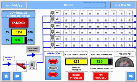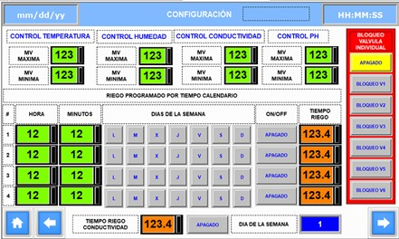 Based on the simulated inputs and configured parameters, the PLC generated output signals that activated or deactivated actuators represented within the HMI interface, including irrigation systems, ventilation equipment, and humidification devices. Figure 5 illustrates the irrigation control screen, which allows the selection between manual and automatic operation modes. The interface supports two irrigation strategies: a scheduled irrigation method based on daily calendars and weekly frequency, and an automatic method driven by soil conductivity measurements.