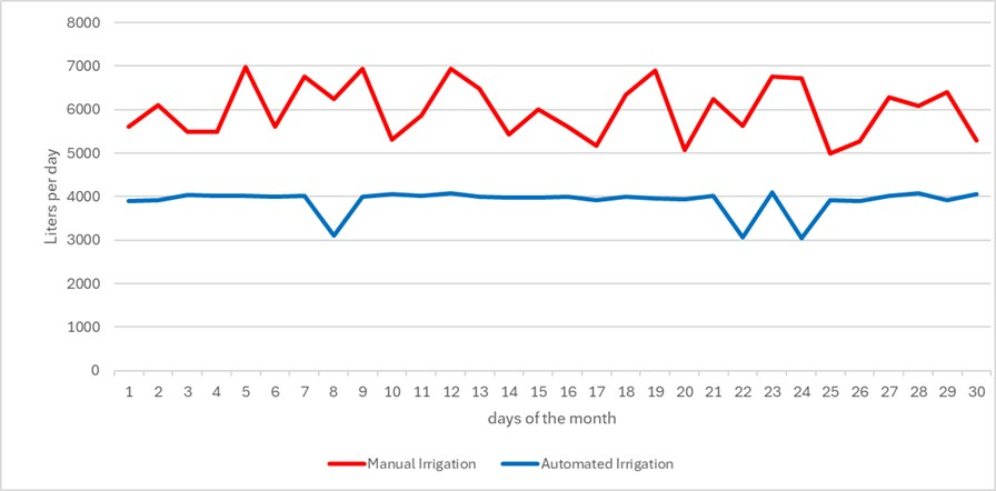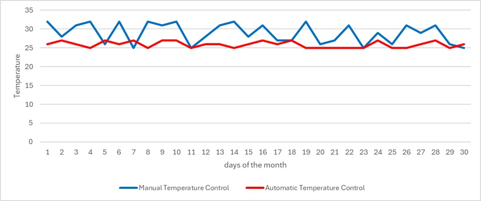 This reduction is primarily attributed to the system’s ability to activate irrigation only when simulated soil moisture values fall below predefined thresholds, thereby preventing over irrigation and unnecessary water use. These projected savings not only contribute to the conservation of water resources, but also represent potential economic benefits for producers by reducing operating costs. In the context of increasing water scarcity and the need for sustainable agricultural practices, efficient irrigation management becomes a critical factor for long term production viability under greenhouse conditions. Precise irrigation control also has a direct influence on crop health and development. By avoiding excessive soil moisture, the automated system reduces the risk of root related diseases and nutrient leaching, which supports more stable plant growth. Additionally, demand-based irrigation aligns water application with the crop’s phenological requirements, supplying water according to simulated plant needs rather than fixed schedules. This approach promotes more consistent growing conditions and improves overall system efficiency. Figure 7 presents a comparison of internal greenhouse temperature variations over an equivalent simulated period, contrasting manual environmental control with automated regulation. Under manual control conditions, temperature values exhibited wider fluctuations, with oscillations of approximately plus or minus seven degrees Celsius. Such variations can generate thermal stress in plants, potentially affecting key physiological processes such as photosynthesis, transpiration, and flowering. In contrast, the automated system-maintained temperature within a narrower operating range, demonstrating improved stability under simulated conditions.
