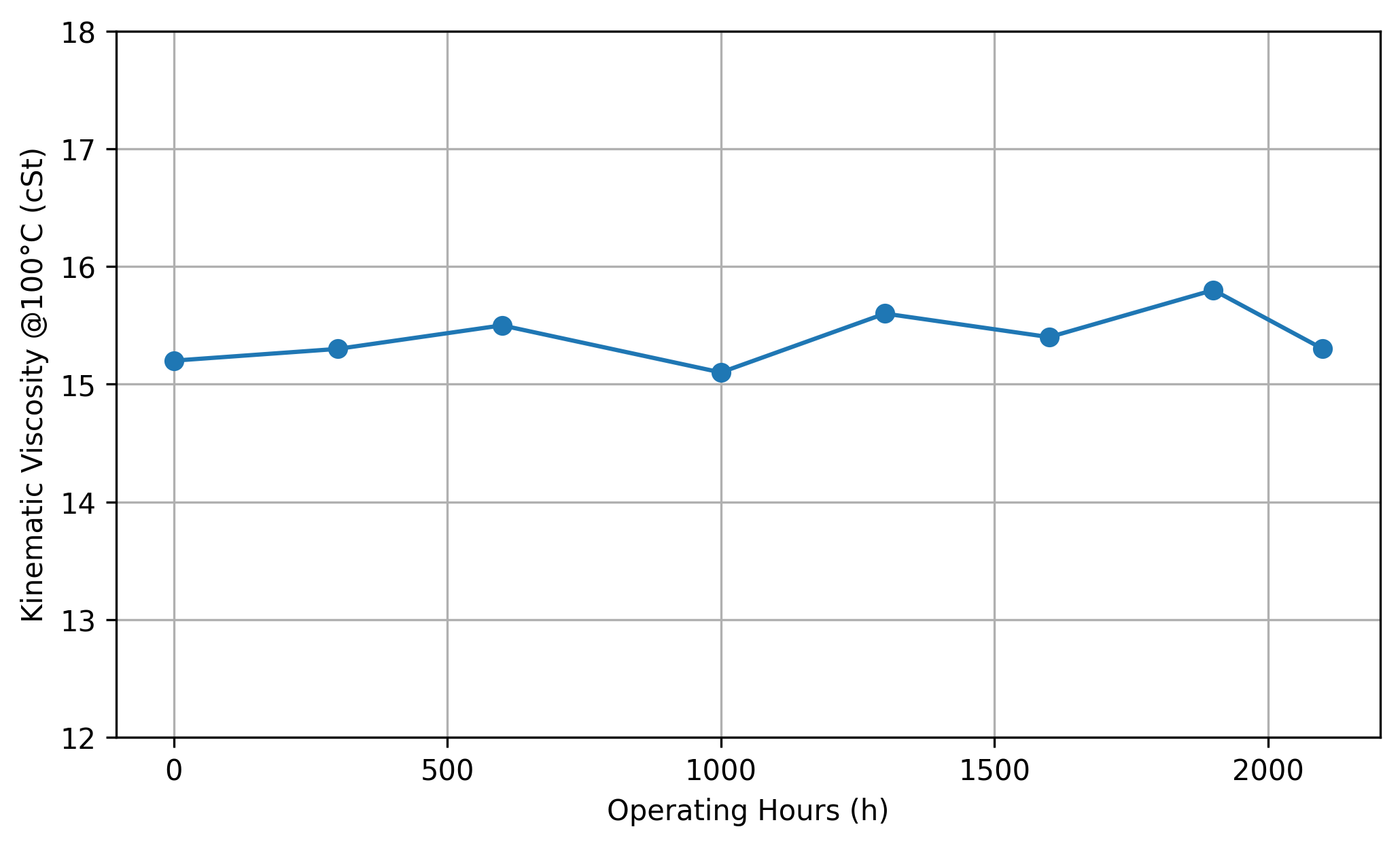 - Viscosity (100 °C) remained within the acceptable range (12.5–17.9 cSt), averaging ≈ 15 cSt, indicating stable mechanical performance.