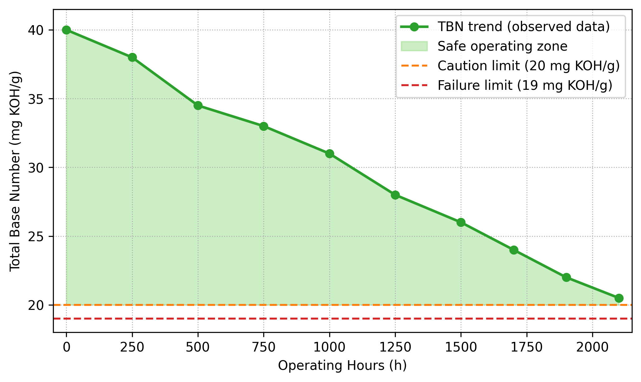 - Total Base Number (TBN) representing the alkaline reserve that neutralizes acidic by-products declined gradually from 35–40 mg KOH/g toward the caution limit of 20 mg KOH/g.