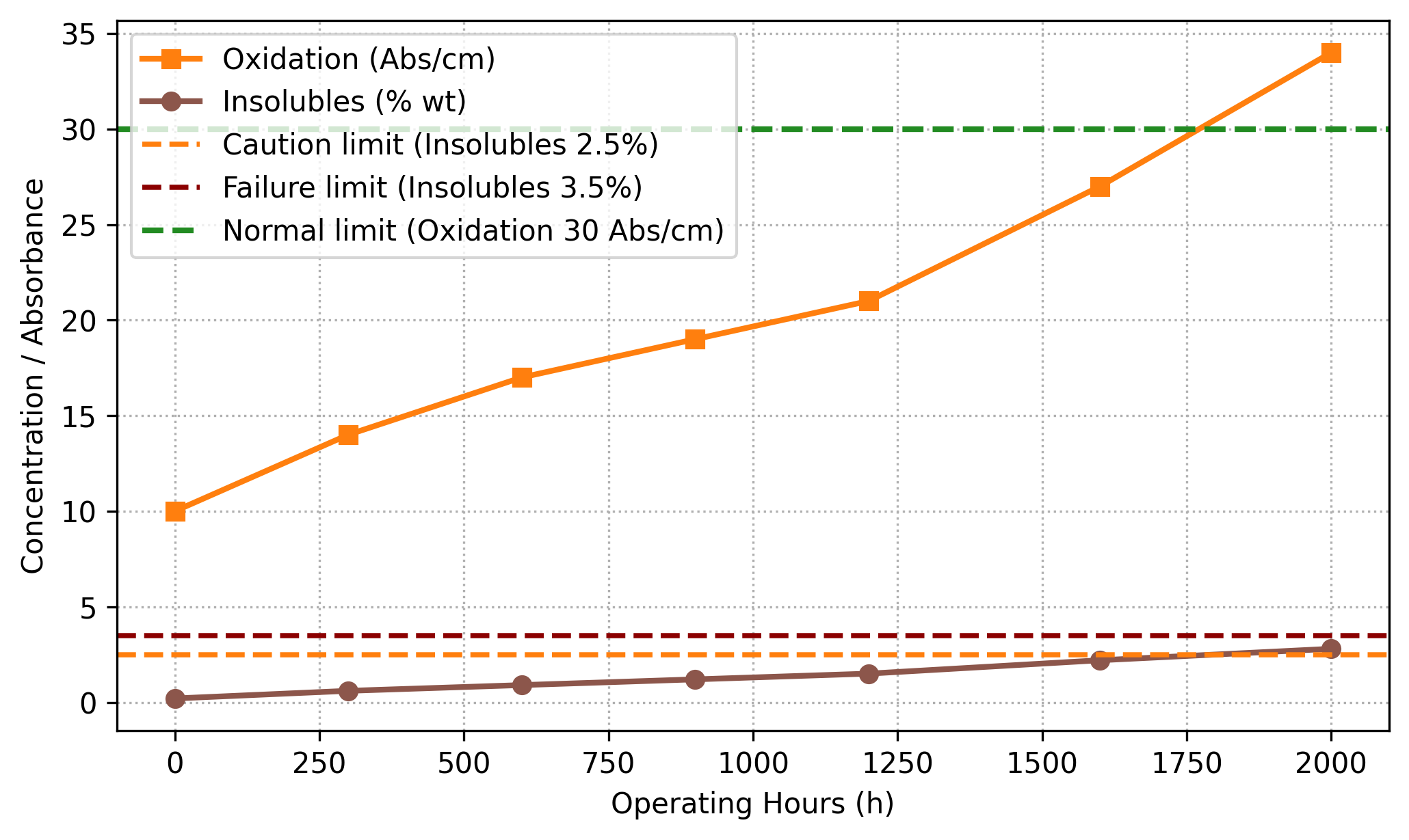 Through stochastic indicator evolution modeling and threshold-based failure criteria (e.g., TBN < 20 mg KOH/g or Ni > 300 ppm), we calculate a time-dependent failure probability. For reliability modeling, a lubricant variable crossing its critical threshold is understood as a proxy failure event, indicating that continuous operation would likely exacerbate damage if maintenance were not undertaken. Quantitative reliability assessment is possible without mechanical failures with this methodology.