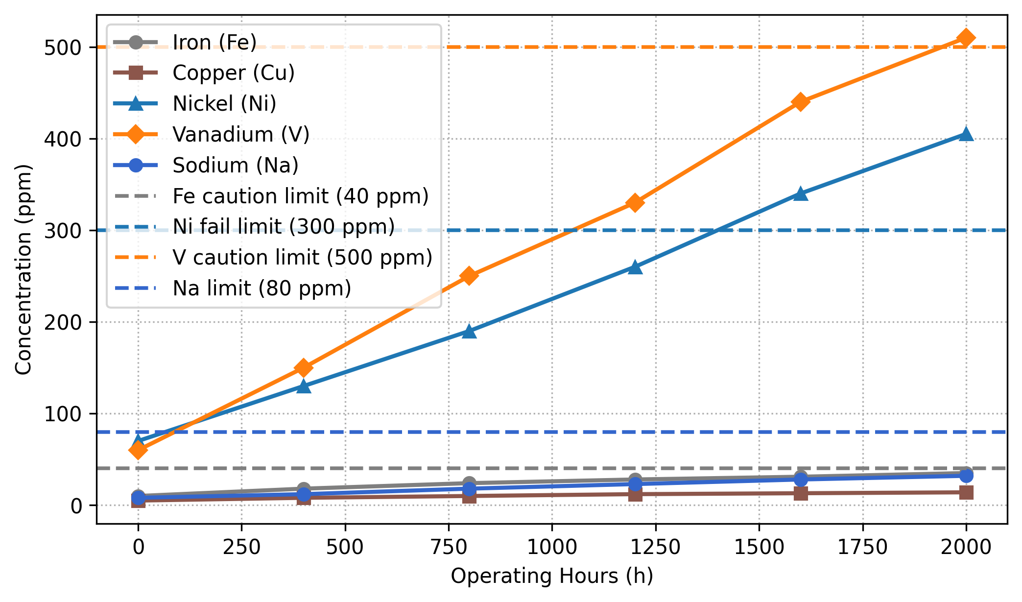 - Metal contaminants, particularly Ni and V, rose nearly linearly with operating hours: Ni from ~50 ppm to >400 ppm and V from ~75 ppm to >500 ppm.