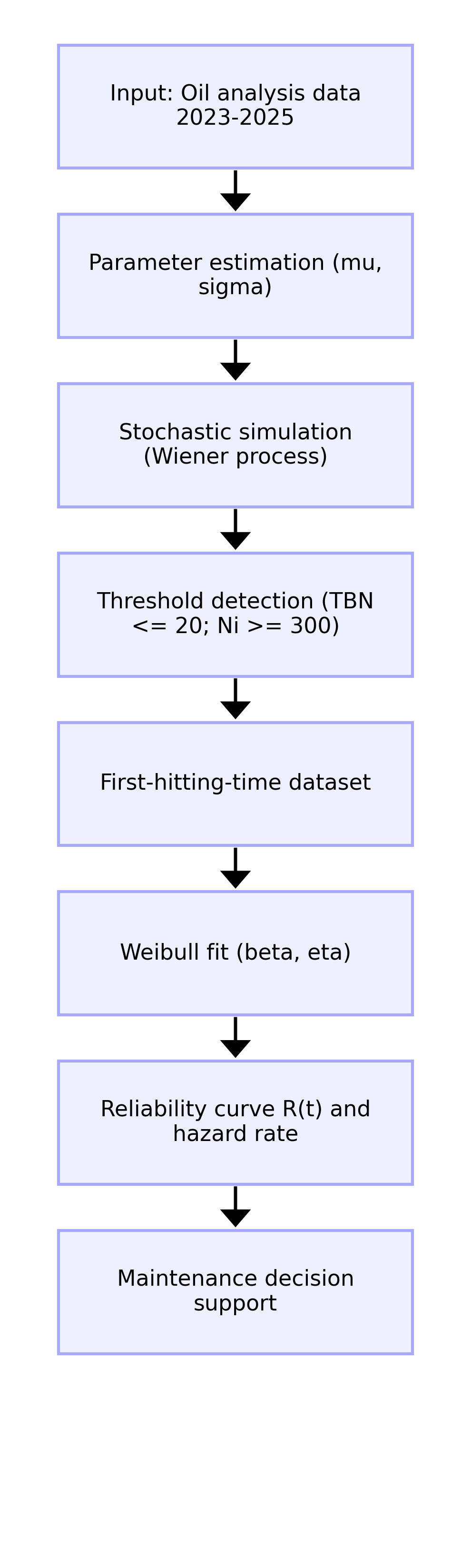 where X(0) is the initial value of the indicator (fresh oil), μ is the drift coefficient representing the expected rate of change per unit time, and σ is the diffusion coefficient that scales random variability. W(t) is a standard Wiener process (Brownian motion) with E[W(t)]=0 and Var[W(t)]=t. A negative drift (μ<0) indicates progressive depletion (e.g., TBN decline), whereas a positive drift (μ>0) corresponds to accumulation (e.g., Ni or V contamination). The deterministic component μt reflects the average trend, while σW(t) captures stochastic deviations due to fluctuations in load, temperature, fuel composition, and measurement noise. Parameter estimation follows the method of moments or regression of sequential oil analyses: μ is derived from the mean rate of change ΔX/Δt, and σ from the variance of these increments or model residuals. If measurement error is significant, a state-space formulation can be employed to separate process noise from observation noise. In practical prognostics, both parameters are critical higher σ implies greater uncertainty in the predicted time-to-threshold and wider reliability bounds.