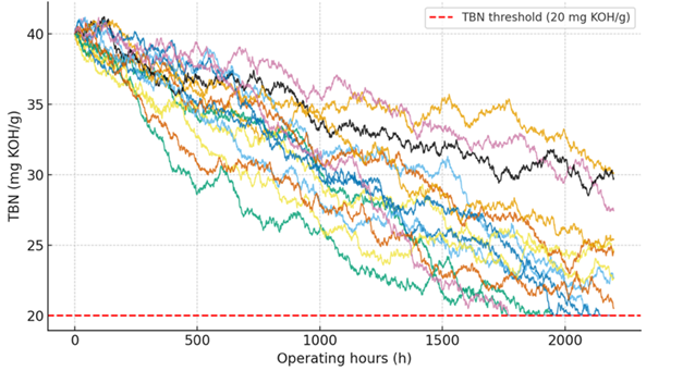 Figure 9 illustrates the stochastic dispersion of TBN values over time, showing how multiple simulated trajectories converge toward the critical limit of 20 mg KOH/g after approximately 1900 h of operation.