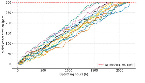 V Process and Correlations: Vanadium contamination V(t) behaves analogously to Ni (t), with a similar drift rate (μV ≈+0.22 ppm h-1) and diffusion coefficient (σV ≈ 1.0ppm √h-1). Given their common origin in the fuel’s metallic content, Ni and V are strongly correlated (correlation > 0.9 in the dataset). In a multivariate extension, the joint process could be written as: