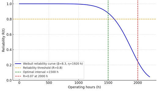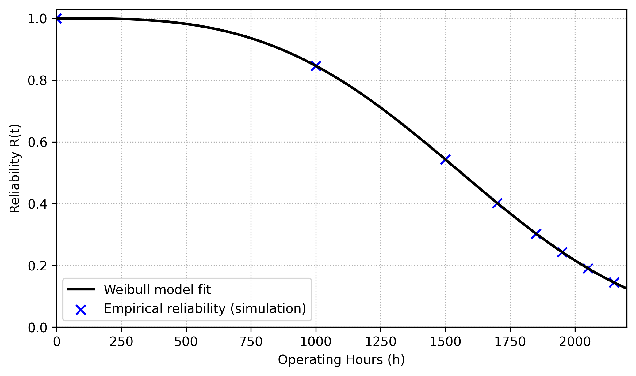 Figure 10 compares the empirical reliability data derived from these simulations with the fitted Weibull model, revealing a strong agreement (R² ≈ 0.93) and confirming that lubricant reliability follows a deterministic wear-out trend characterized by β ≈ 8.3 and η ≈ 1920 h.