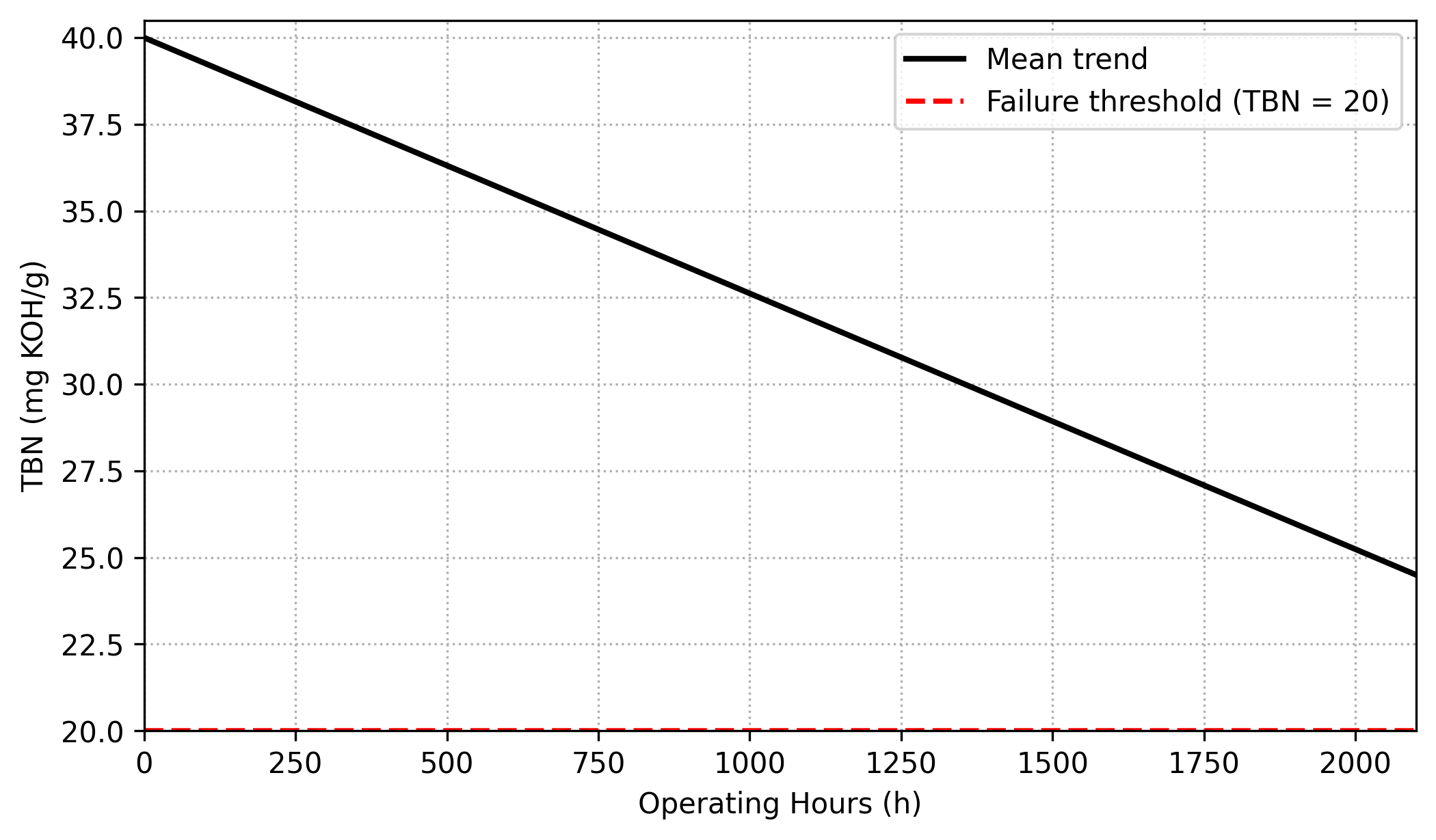 TBN process: The Total Base Number (TBN) declines monotonically with operation time due to additive depletion and acid formation. A negative dirftμTBN < 0 is therefore assumed. From field data, a representative mean rate of change is μTBN ≈ -0.088 mg KOHg-1h-1 . For instance, between November 2024 and February 2025, TBN dropped from 35.6 to 20.4 mg KOH/g over 2048 h, an average rate near −0.0075 mg/h. The diffusion term σTBN reflects random fluctuations and laboratory uncertainty. Based on observed variability, we adopt σTBN ≈ 0.10mg KOH g-1√h, which produces root-mean-square deviations of ≈1.4 mg after 200 h and ≈3.2 mg after 1000 h consistent with sample-to-sample oscillations. Thus, the stochastic term realistically captures operational and measurement variability around the downward trend.
