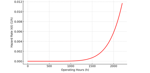 Figure 11 presents the corresponding hazard-rate function λ(t), which highlights the exponential increase in failure probability beyond 1800 h, defining a practical reliability-based replacement interval of roughly 1500 h for optimal maintenance planning.