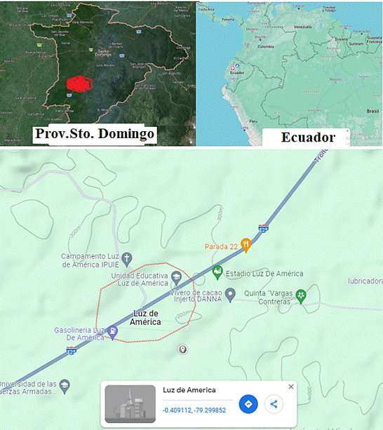 El presente trabajo se llevó a cabo en la parroquia rural Luz de América (0°24'20"S 79°18'01"O), perteneciente a la provincia de los Santo Domingo de los Tsáchilas, y está ubicada a 23 Kilómetros de la capital de la provincia (Fig.2).