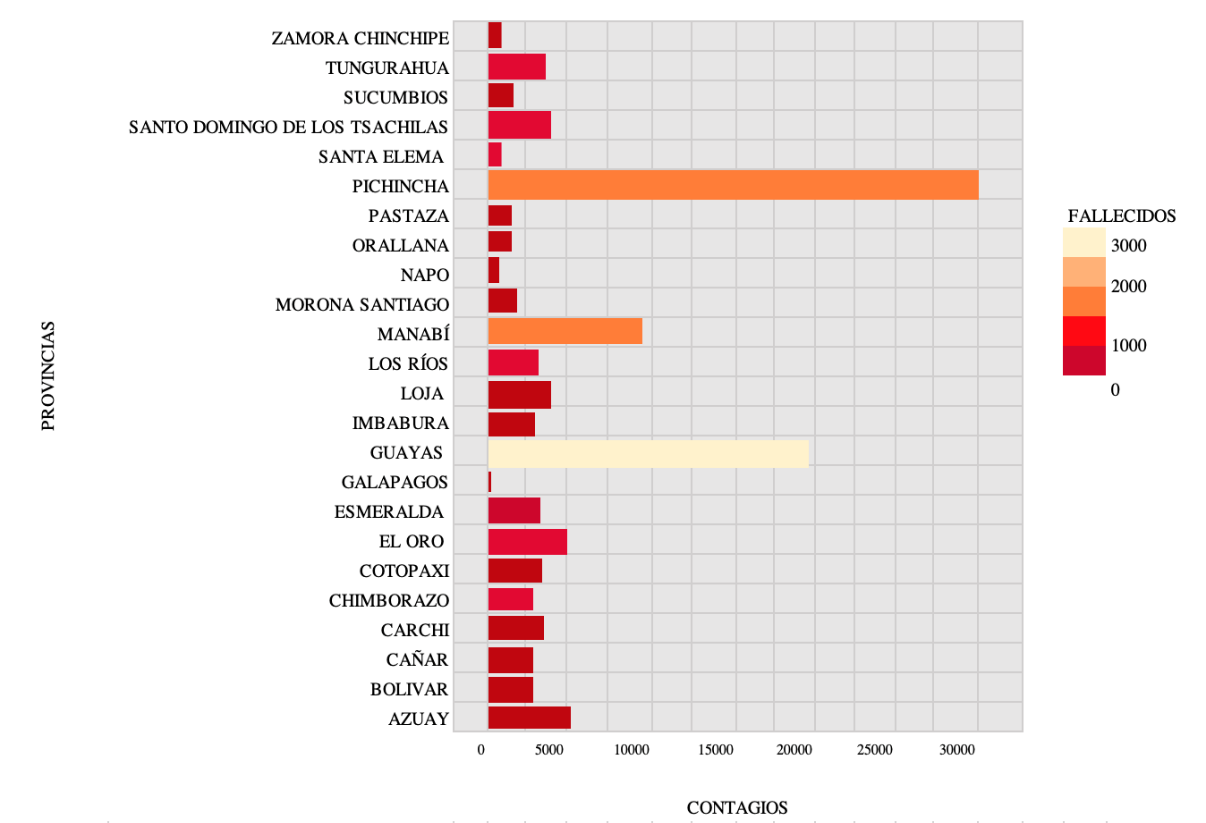 Según los datos analizados por el sistema Rstudio, la siguiente gráfica (Fig. 2) analiza la cantidad total de los contagios por COVID-19 en las 24 provincias del Ecuador, al finalizar el día 187 de la pandemia (Sacco et al., 2022). Obteniendo como resultado que ampliamente la provincia de Pichincha (Color naranja) presenta una cantidad total de 29.756 casos confirmados desde el comienzo de la propagación del virus, seguido de la provincia de Guayas (Color Amarillo claro) con un total de 19.922 contagiados. Sin embargo, se registra un mayor número de defunciones en Guayas que en Pichincha. Mientras que en la provincia de las Galápagos de encuentra en último lugar con un total de 183 casos confirmados y una defunción.