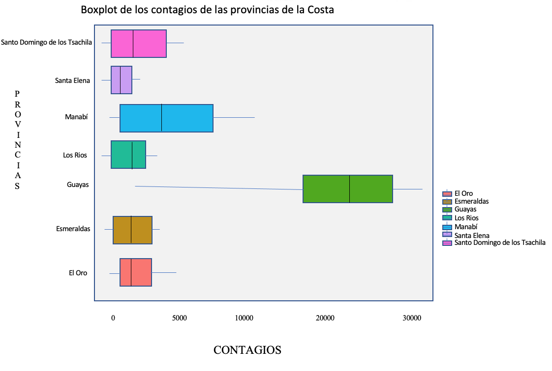 Mediante el diagrama de boxplot que se muestra en la Figura 4, se puede visualizar en el eje horizontal el número de contagios que existe en cada provincia de la Costa, mismo que evidencia que la provincia del Guayas (Color Verde) presenta una mediana de contagios superando los 10.000 casos confirmados de COVID-19 y un alcance máximo de casi 20.000 contagios durante los 187 días que se tomaron para este estudio.