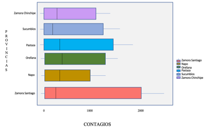 Mediante el diagrama de la Figura 6, se puede visualizar en el eje horizontal el número de personas contagiadas que presenta cada provincia de la región Amazónica, donde se evidencia que la provincia de Morona Santiago (Color Rosa) alcanzó un máximo de contagios aproximado a los 2.000 casos confirmados durante los 187 días que se tomaron para este estudio. Aunque fue la más alta en esta región, no se encuentra entre las más afectadas a nivel nacional.