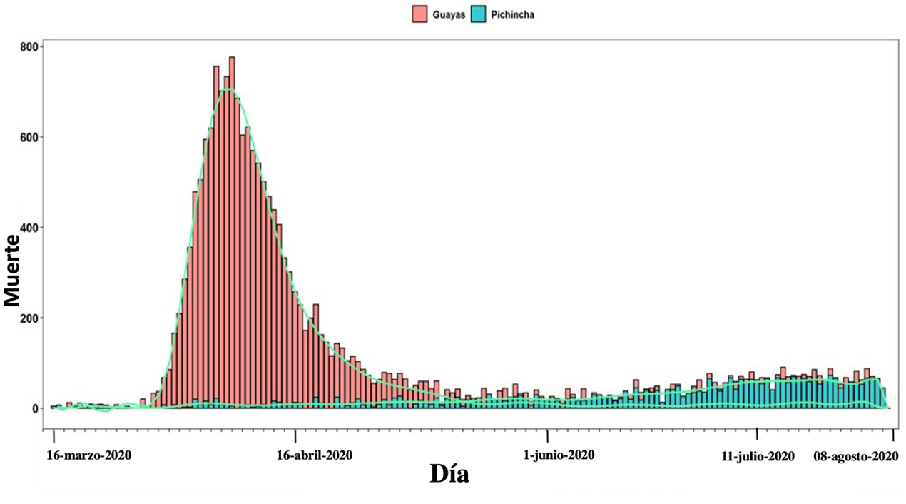 Según el gráfico respalda el hecho de que Pichincha no fue el centro de la pandemia en Ecuador porque su exceso de muertes es extremadamente inferior al que ocurrió en Guayaquil. Además, la forma del exceso diario de evolución en Guayas es totalmente diferente a Pichincha.