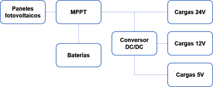 El esquema general del OGH Caso 2 se muestra en la Fig. 2. En esta configuración se excluye el inversor de potencia y se trabaja directamente en DC. El proceso entre los módulos fotovoltaicos, controlador y baterías es análogo al del OHG Caso 1. Pero en este sistema, las cargas instaladas requieren varios niveles de tensión, las cargas de 24V son alimentadas directamente y para las demás necesidades se realiza el ajuste mediante conversores DC/DC (5V – 19V).