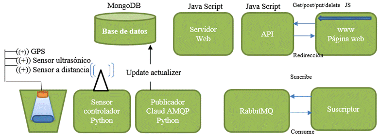Con relación al diagrama de arquitectura, se presenta la fluencia de datos, desde la base NoSQL MongoDB Atlas, cuyos datos fluyen hacia el servidor Web y la respectiva página web, mientras que, la plataforma de desarrollo: Python, actúa de publicador conectado a los sensores de control que, a su vez, permiten el trabajo eficiente del servidor de cola de mensaje: RabbitMQ, que facilita el envío y archivo de los mensajes a los suscriptores del servicio de recolección de residuos sólidos.