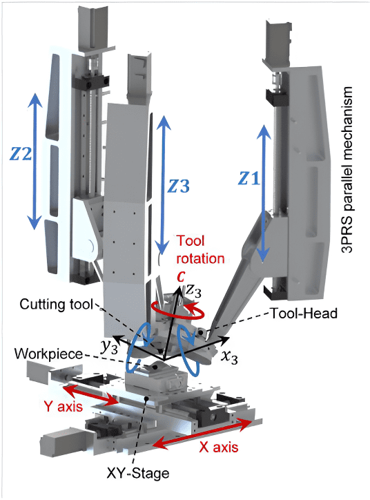 For this study, a single-edged cutting machine is used, which has a system of three parallel axes to position the tool (López-Estrada et al., 2018). The parallel system has a prismatic, revolute and spherical joint (PRS) on each axis. This mechanism serves to orient the rotational axis C of the tool. In addition to expanding the operating range, it has an XY-stage that moves the workpiece (Fajardo-Pruna et al., 2019). Figure 7 is a representation without a casing of the machine.