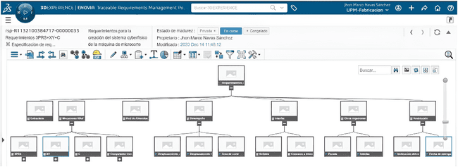 The second option stands out as it enables the creation of models closely attached to the physical design, is easily expandable from the control of the physical model to the virtual one and is highly flexible due to its block design for the control systems. The platform environment controls the communication between programs and systems, reducing information loss. The system requirements were managed and developed in tiers in the first stage using Enovia's requirements database tool. Figure 8 shows the requirements tree in a simplified way next to the Enovia framework.