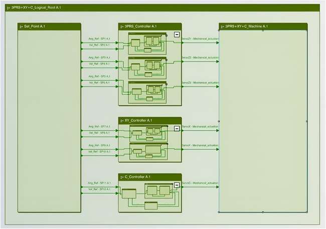 The 3PRS+XY+C_Machine block describes the complete model of the mechanical system (structure, joints and tool). It is divided into internal blocks that contain the mechanical information of each designed part and the engineering connections made in CATIA-Mechanical Systems Design. Figure 14 shows the signals and the block that includes the mechanical model of the system. The six signals from each actuator feed the model.