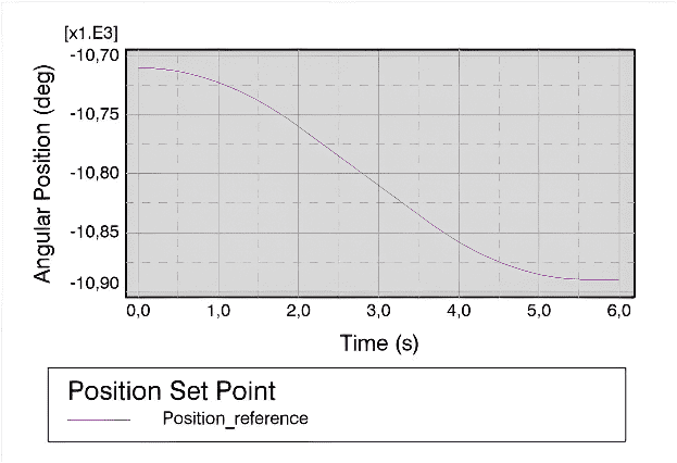 The simulation was carried out in the "CATIA-Functional &Logical Design" environment "with the "Simulate" tool of "Behaviours". A test was carried out around the starting point of the system. A step type change was made as boot. Immediately after this step signal, a decreasing position change signal was configured with speed and acceleration to represent a smoother behaviour. Figure 12 shows the position signal delivered as a reference, which has been simulated for six seconds.