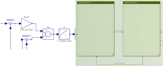 Subsequently, the structure of the position and speed controller for an actuator was defined. A P-PI cascade control was carried out for position and velocity, respectively. The control parameters are managed by variables managed from the requirements. Figure 13 shows the parameterised controller, operating point, and feedback signals as inputs. These blocks contain the current controller, the electromotive circuit model, and the mechanical characteristics of the motor and its reduction gearbox. The power signals sent to the motor and the current as feedback to the control circuit are handled. The signals shown in Figure13b (with enlarged capture) are "Power_signal", which contains the power reference sent to the actuator, and "Motor_current", which feeds back the current value.