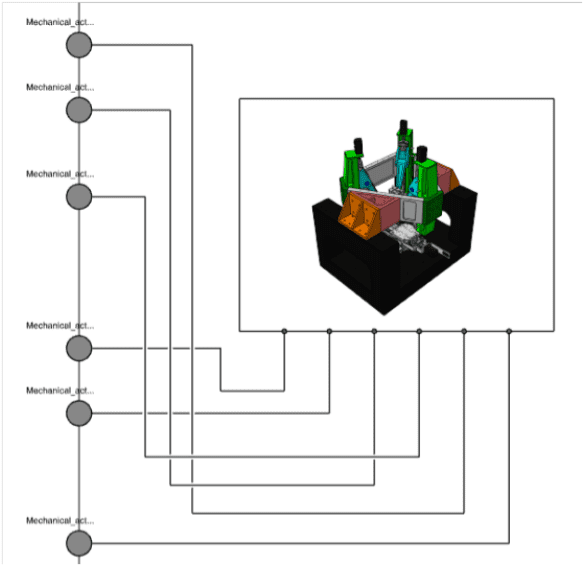 It should be considered that the realisation of digital twins always starts from a functional design and the necessary elements, considering the joints on which the mechanism is actuated for the completion of the mechanical model. The mechanical representation must be configured so that the drive matches the behaviour model from the actuator.