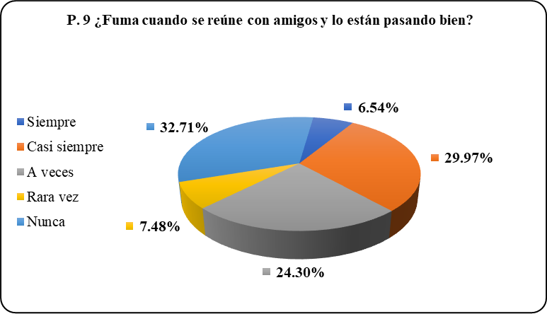 9 ¿Fuma cuando se reúne con amigos y lo están pasando bien? Nunca Rara Vez A veces Casi siempre Siempre |