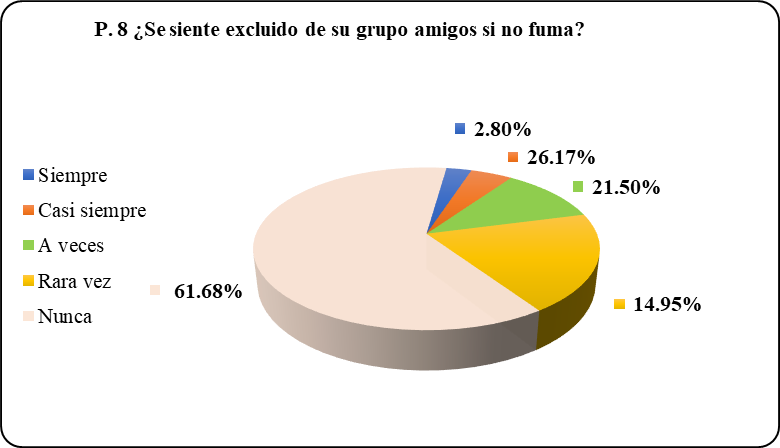 En el gráfico 7 se identificó la distribución de los siguientes resultados: el 2,80% es para el siempre, el 4,67% es para el casi siempre, el 11,21% es para el a veces, el 19,63% es para el rara vez y el 61,68% es para el nunca. Por lo que podemos interpretar que la mayoría de las personas encuestadas no se sienten excluidas de su grupo de amigos cuando estos fuman.