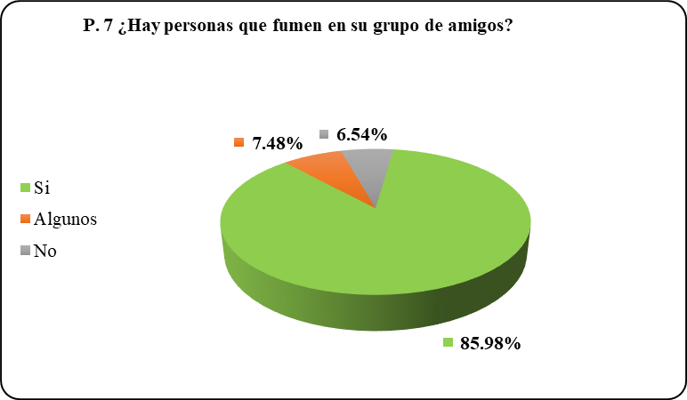 En el gráfico 6 se identificó la distribución de los siguientes resultados: el 85,98% es para el sí, el 7,48% es para algunos y el 6,54% es para el no. Por lo que podemos interpretar que la mayoría de las personas encuestadas tienes amigos que consumen tabaco.