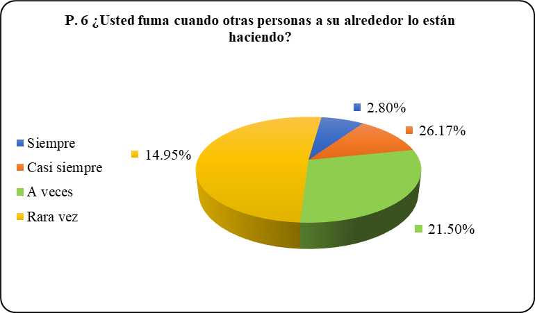 En el gráfico 5 se identificó los siguientes resultados: el 2,80% es para el siempre, el 26,17% es para el casi siempre, el 21,50% es para el a veces, el 14,95% es para rara vez y el 34,58% es para el nunca. Por lo que podemos interpretar que un 65,42% de las personas encuestadas han fumado alguna vez cuando otras personas lo están haciendo a su alrededor.
