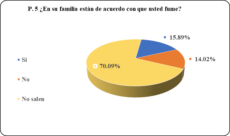 Como se observa en el gráfico 4 se identificó los siguientes resultados: el 15,89% es para el sí, el 14,02% es para no lo saben y el 70,09% es para el no. Por lo que podemos interpretar que los familiares de las personas encuestadas no están de acuerdo con el consumo de tabaco.