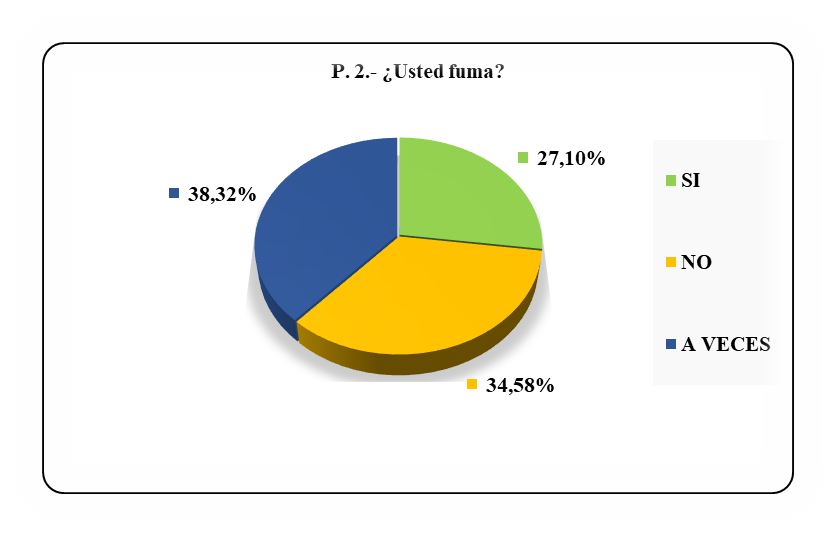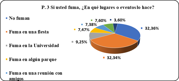 En el gráfico 2, se observa que el lugar dónde los jóvenes más fuman es en una fiesta, con el 32.34% y otro porcentaje representativo es que no fuman el 32.36%. Las estrategias de prevención a aplicar son en los eventos sociales donde hay mayor concentración de los jóvenes.