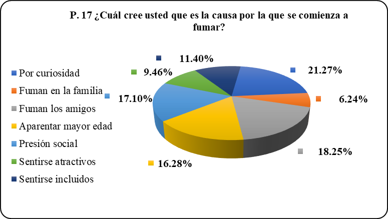En el gráfico 16 se podía escoger más de una respuesta por lo que; el 21.27% escogieron por curiosidad, el 6,24% escogieron por que fuman en la familia, un 18.25% escogieron por que los amigos fuman, un 16.28% escogieron por aparentar mayor edad, un 17,10% escogieron por presión social, un 9.46% escogieron por sentirse atractivos y un 11,40% escogieron para sentirse incluidos. Por lo que podemos interpretar que la principal causa-razón por la que los adolescentes comienzan a fumar es por curiosidad, seguido de por la influencia de sus amistades.