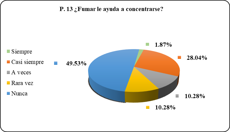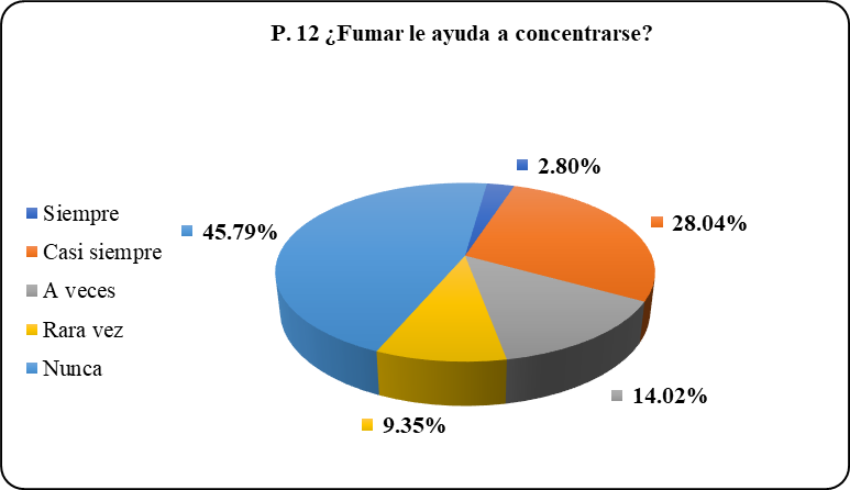 En el gráfico 12 se identificó los siguientes resultados: el 1,87% es para el siempre, el 28,04% es para el casi siempre, el 10,28% es para el a veces, el 10,28% es para la rara vez y el 49,53% es para el nunca. Por lo que podemos interpretar que un 50,47% de las personas encuestadas han fumado alguna vez para concentrarse.