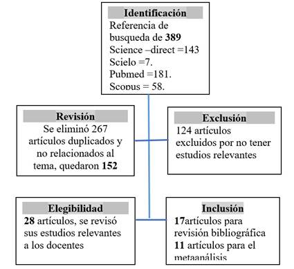 Al inicio de la búsqueda de información se encontraron alrededor 389 trabajos de investigación; no obstante, al aplicar los criterios establecidos para su inclusión, únicamente 28 de ellos pasan a formar parte de una lectura crítica y analítica, de los cuales 17 para referencias y 11 de ellos para el metaanálisis final (Fig. 1).