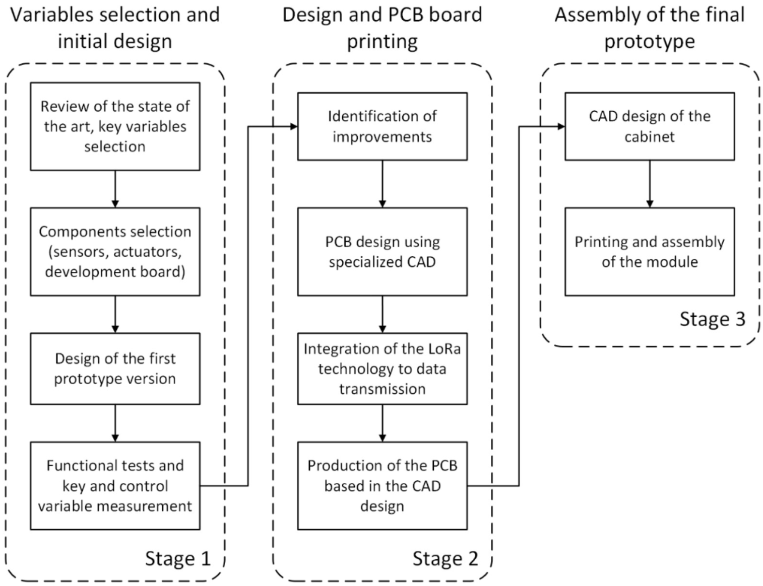 The development of the control and monitoring module for solar dryers was divided into three main stages: initial design and first tests on Arduino, identification of improvements and design of dedicated board, and, finally, assembly of dedicated card and module cabinet. LoRa technology is integrated throughout the process to allow remote monitoring of critical variables in the drying process. Figure 1 below shows the general methodology followed for its development.