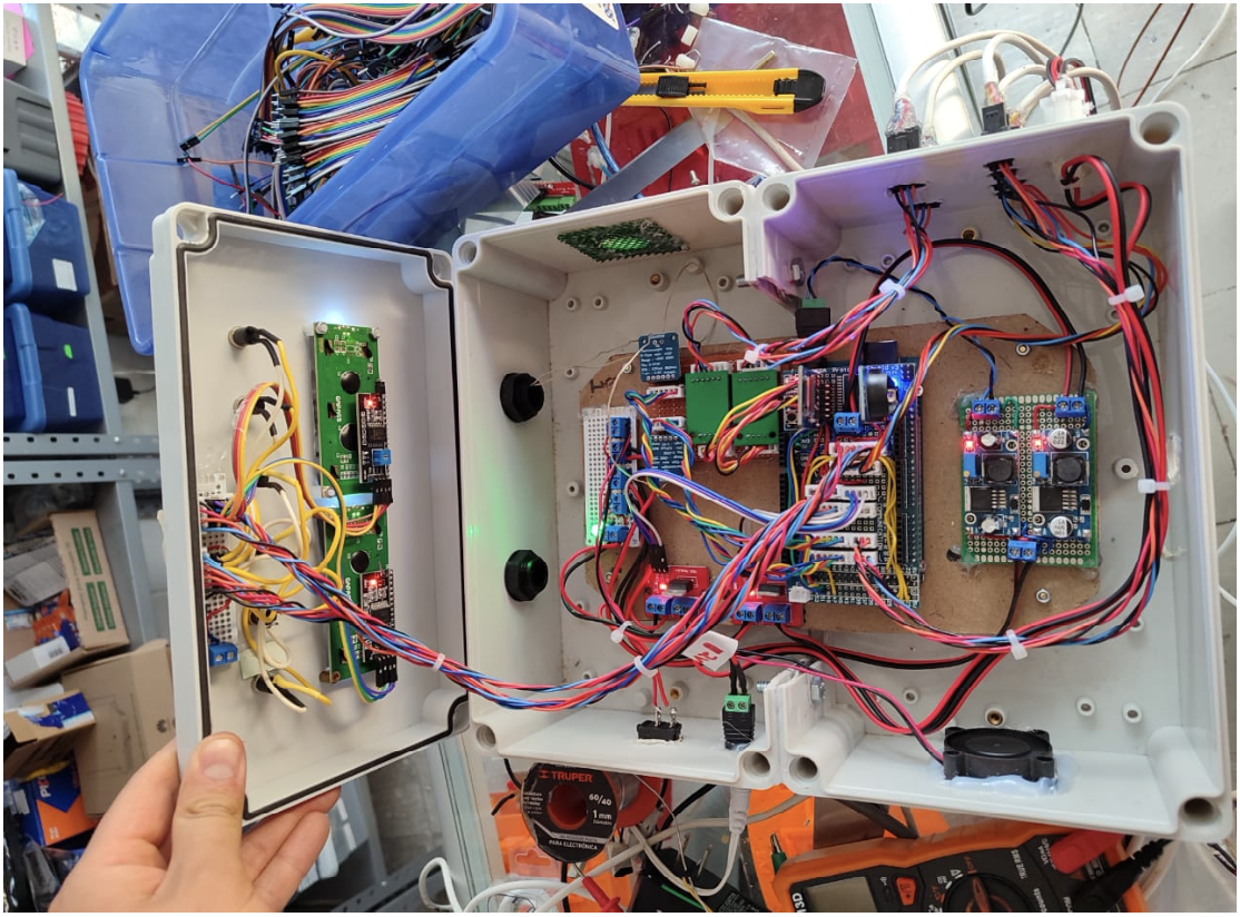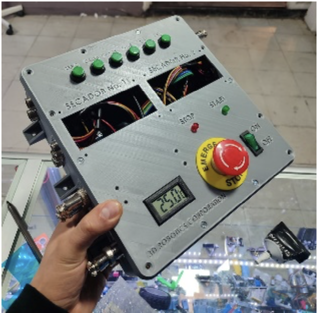 Solar drying is a technique used since ancient times for food preservation, and it is still used to this day, especially in places where access to conventional energy generation technologies is limited (Ly, 2024). Drying food using the sun's energy can be differentiated into two broad categories: drying by direct exposure to the sun and solar drying in confined spaces. Drying by direct exposure is not advisable for hygiene and safety reasons since the product to be dried is directly exposed to the sun and the surrounding environment and can easily be contaminated with dust and germs. In confined space drying, the product to be dried is placed inside a shed or greenhouse with the aim of improving the capture of heat from the sun through the greenhouse effect, and also protecting the product from the environment. However, both techniques depend on the availability of the sun and therefore on changing climatic conditions, which translates into significant challenges for ensuring the efficiency of the process through control and monitoring technologies (Yao et al., 2022), the main variables that can affect the solar drying process are temperature and relative humidity. Considering the environmental challenges and global warming that humanity is currently facing, increasing the use of renewable energy-based technologies for agribusiness is essential, and improving their efficiency is a priority to make these technologies competitive (Kumar et al., 2019). One way to improve the drying process using technology is to implement microcontrollers and sensors that allow the incorporation of control and monitoring strategies for these systems (Elwakeel et al., 2023). Dryers where the product is placed in a confined space are classified as passive dryers, if they are natural convection, and active, if they are forced convection for internal airflow, in the case presented in this work we work on the type of active drying (Ortiz-Rodríguez et al., 2022). However, as mentioned, solar drying is strongly dependent on weather conditions. To mitigate the variability of the drying process in the face of changing climatic conditions, various control and monitoring strategies have been proposed to improve the performance of solar dryers (Mujumdar, 2004). The review of the literature showed that there are several approaches to integrate relative humidity and temperature sensors for automatic adjustment inside solar dryers, however, these solutions have limitations in terms of their ability to adapt to rapid climate changes and high probability of failure for demanding applications (Su et al., 2014). The integration of development platforms such as the Arduino is an effective and low-cost way to experiment with monitoring and control systems for solar dryers (Chakravartula et al., 2023). However, most of the Arduino platform integrations for this type of application are too simple and do not allow the testing of complex control strategies or remote monitoring and control. There are currently several long-distance communication protocols that are attractive for agribusiness where the location of solar dryers is not always in places with good telecommunications signal coverage, in this sense, LoRa (Long Range) technology is very interesting (Fuentes & Tamura, 2020; Yooyativong et al., 2023). However, the application of LoRa for solar dryers remains limited, and more extensive evaluations are needed (Rachmani & Zulkifli, 2018). In the work shown in (Vengsungnle et al., 2020), the authors show a rule-based control system to control the extraction of hot air inside a greenhouse-type dryer, they observed that including a closed-loop control has a significantly higher efficiency than traditional drying. In the review made by (Mohana et al., 2020), after comparing various works on dryer architectures, it is defined that there is a significant knowledge gap in the development of monitoring and control systems for active solar dryers. In the works presented by (Choosumrong et al., 2023; Aumporn et al.), implementations of control cards for solar dryers are shown implementing some type of rule-based control; however, the system implemented in these works does not have the versatility of being a custom design card for the application of solar drying, and neither is it an adaptable module to be easily connected to different dryers, being dedicated and expensive solutions. This work presents the development of a control and data acquisition module for remote monitoring and improvement of drying efficiency in solar dryers, capable of being programmed with different control modes and connected to dryers of different types and scales.