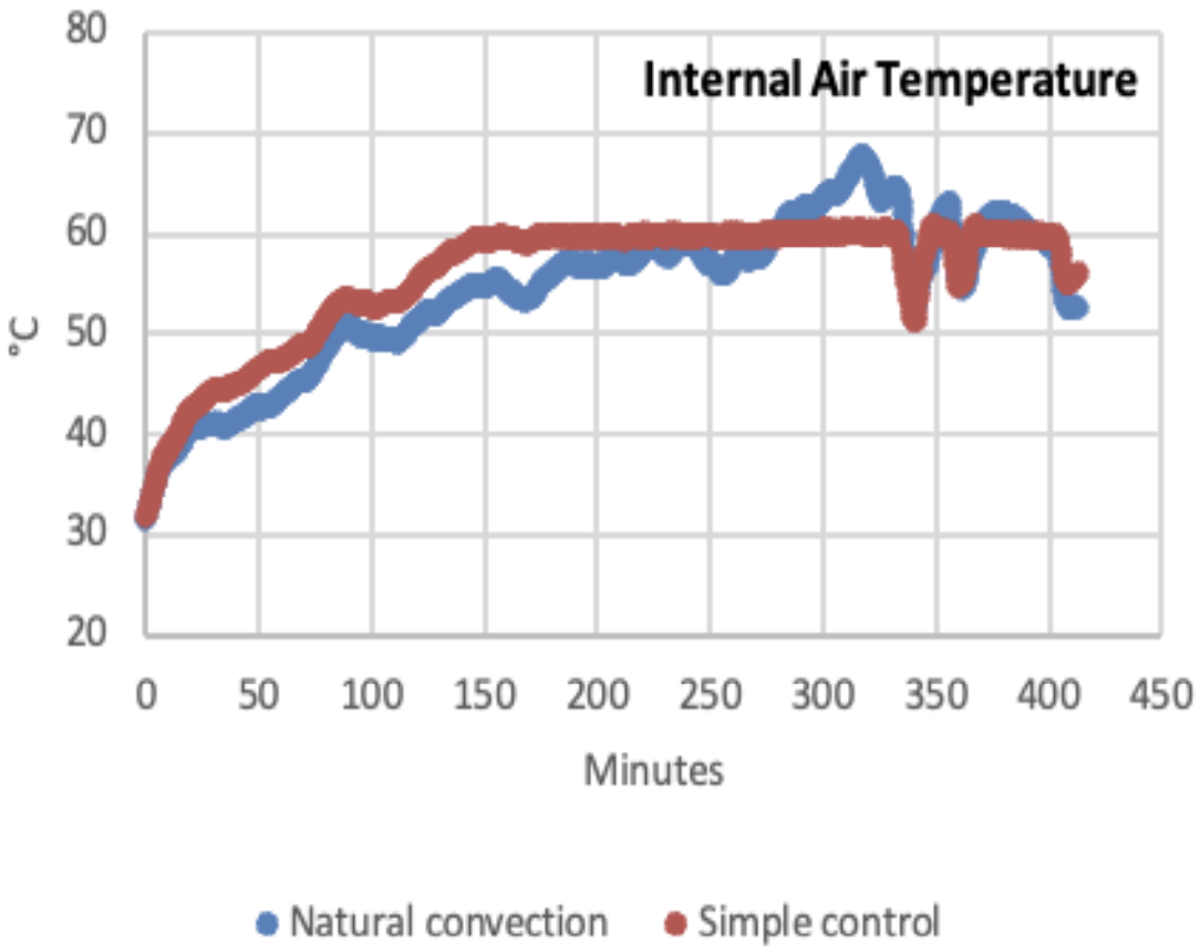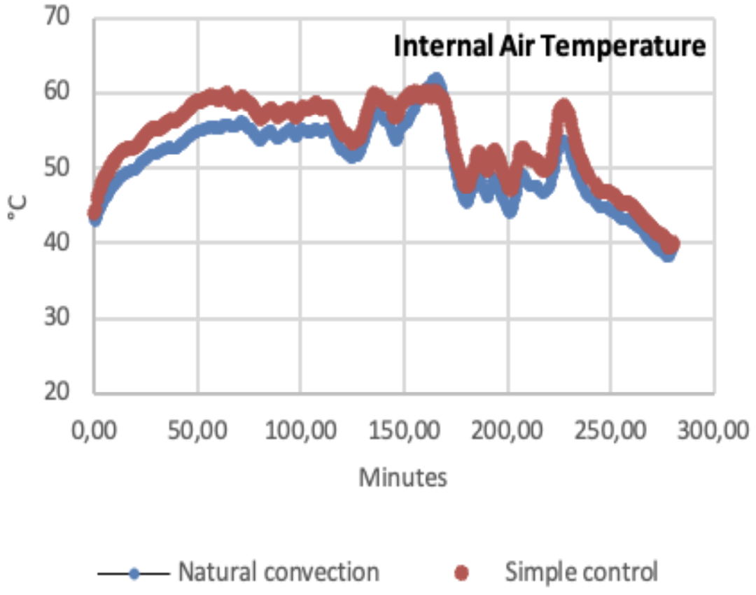 As can be seen in Figure 4 above, the module presented in this work demonstrated remarkable performance in real climatic conditions. The measurements shown in Figure 4 were experiments carried out under typical weather conditions in the month of May in Morelos, Zacatecas. The climate of that region during that season is semi-arid, with daytime temperatures between 30 °C and 35 °C with an average relative humidity of 20% to 40% and high solar irradiation, factors that favor solar drying. In the tests carried out during the day of May 27, the solar dryer equipped with the developed module maintained an average internal temperature of 48.5 °C (+- 2.3 °C) for the first 150 minutes, while in a solar dryer without the control module and operating under natural convection there were fluctuations between 35 °C and 40 °C and an average of 37.8 °C. with a thermal variability of approximately +- 5.6 °C. In tests conducted on May 29, the average internal temperature of the dryer with the control module was 49.2 °C (+-2.1 °C), while the natural convection-only system averaged 38.6 °C (+-6 °C). The results obtained show that the implemented control module increases thermal efficiency by reducing temperature variability inside the solar dryer house, thus achieving greater thermal stability and, therefore, controlled drying conditions.