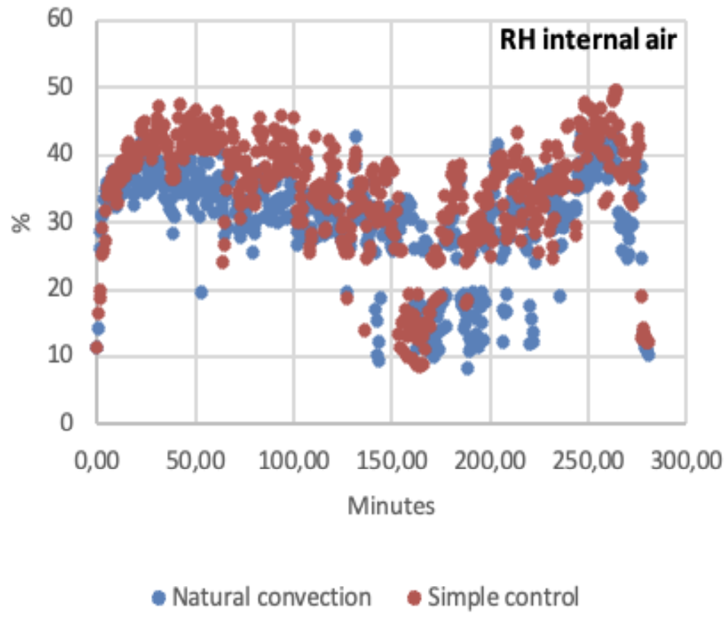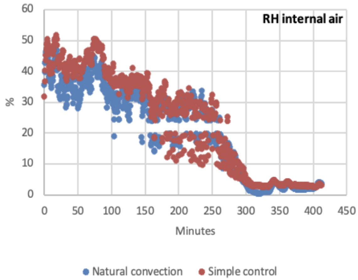 The control of the fans, through programmed strategies, made it possible to optimise the airflow in the solar dryer, adapting to the ambient conditions and significantly improving the efficiency of the drying process. Tests were carried out on May 27 and 29, 2024, in the municipality of Morelos, in the State of Zacatecas, in the United States of Mexico. Figure 5 shows measurements of relative air humidity and internal temperature in the drying cabin for the evaluation of a solar dryer without control module, that is, natural convection mode, compared to a solar dryer with the developed control module implemented along with a simple control strategy based on forced convection controlled by temperature and relative humidity (RH) measurements inside the dryer cabinet.