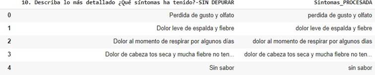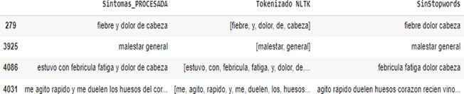 The achievement of the main research objective is reflected in the ability of the proposed method to process Spanish texts and classify relevant information, especially in the context of the symptom column of a database. The use of natural language processing and machine learning techniques stands out as fundamental in this study, as it allows determining the text processing before and after the system training.